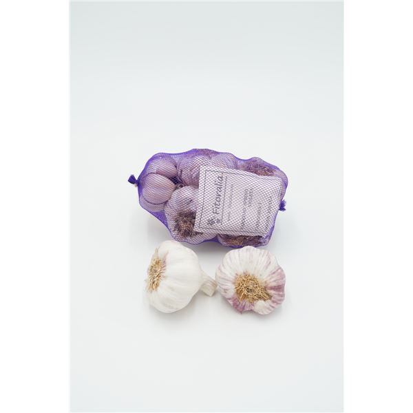 Ajos de siembra. Variedad Spring Violeta. 1a categoría. Siembra durante todo el año para coger en ajo tierno (se puede plantar cabeza entera o dientes desgranados a 1 cm), o siembra de noviembre a febrero para recoger las cabezas para secar posteriormente (siembra diente a diente). Peso: 500 g. Calibre: 70/90 mm